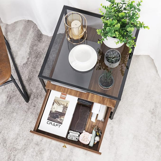 Bedside Table with Drawer: Tempered Glass Sofa Side Table Modern Nightstand with Wood Storage Shelf and Metal Black Frame Small Coffee Table
